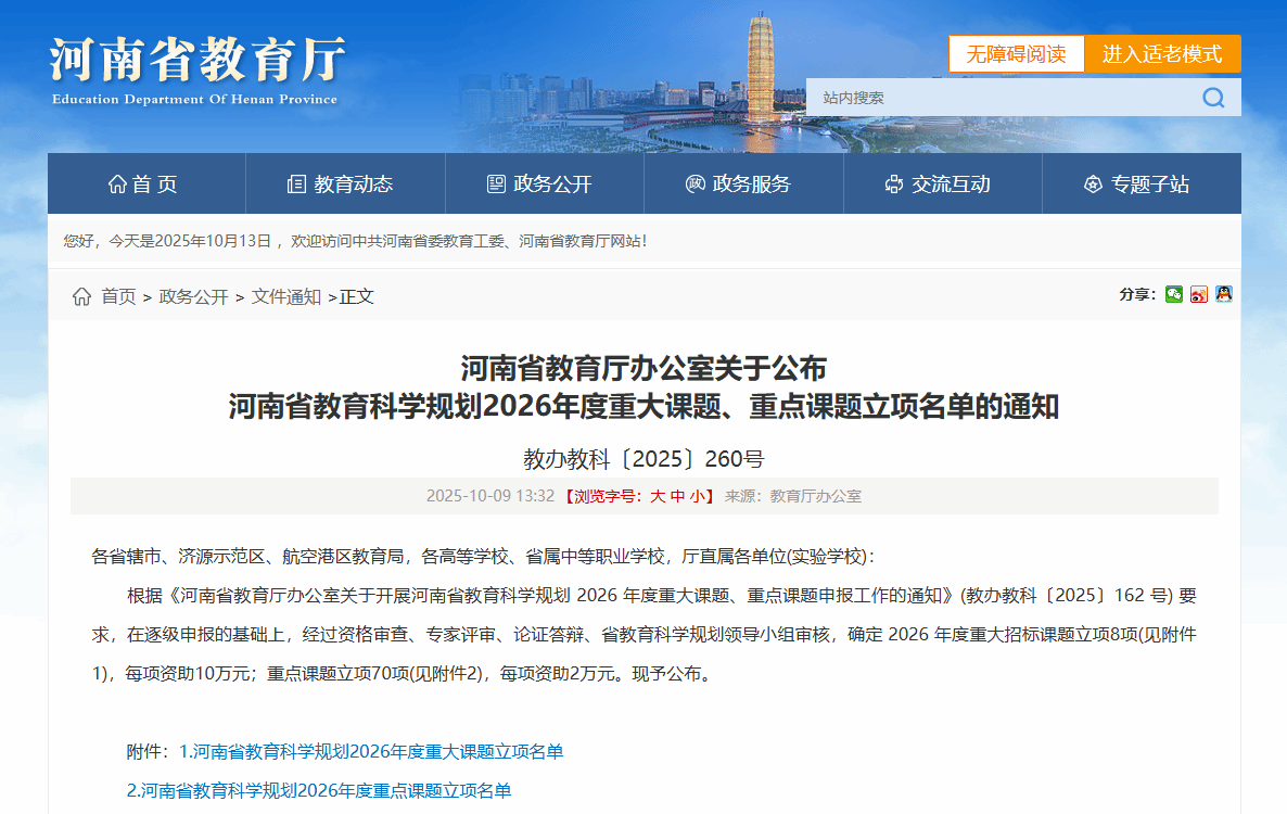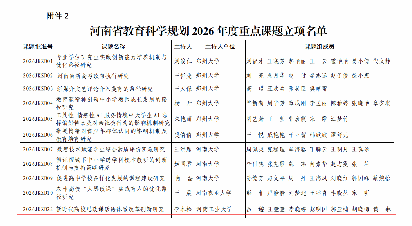 10月9日,河南省教育厅办公室正式公布了《河南省教育科学规划2026年度重大课题、重点课题立项名单的通知》,经过严格资格审查、专家评审、论证答辩及省教育科学规划领导小组审核等多轮遴选,由我院李本松教授主持的“新时代高校思政课话语体系改革创新研究”(课题批准号:2026JKZD22)成功获批河南省教育科学规划2026年度重点课题立项。
