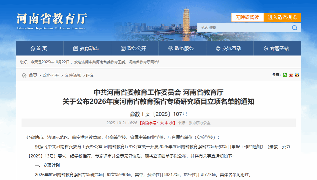近日,中共河南省委教育工作委员会、河南省教育厅公布了《2026年度河南省教育强省专项研究项目立项名单》(豫教工委〔2025〕107号),樱桃直播