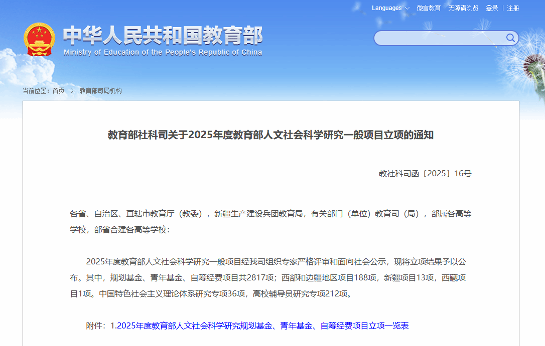 近日,教育部社科司公布了2025年教育部人文社会科学研究项目立项名单,樱桃直播